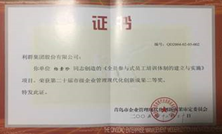 青岛市第二十届企业管理现代化创新及 优秀应用成果二等奖证书 |